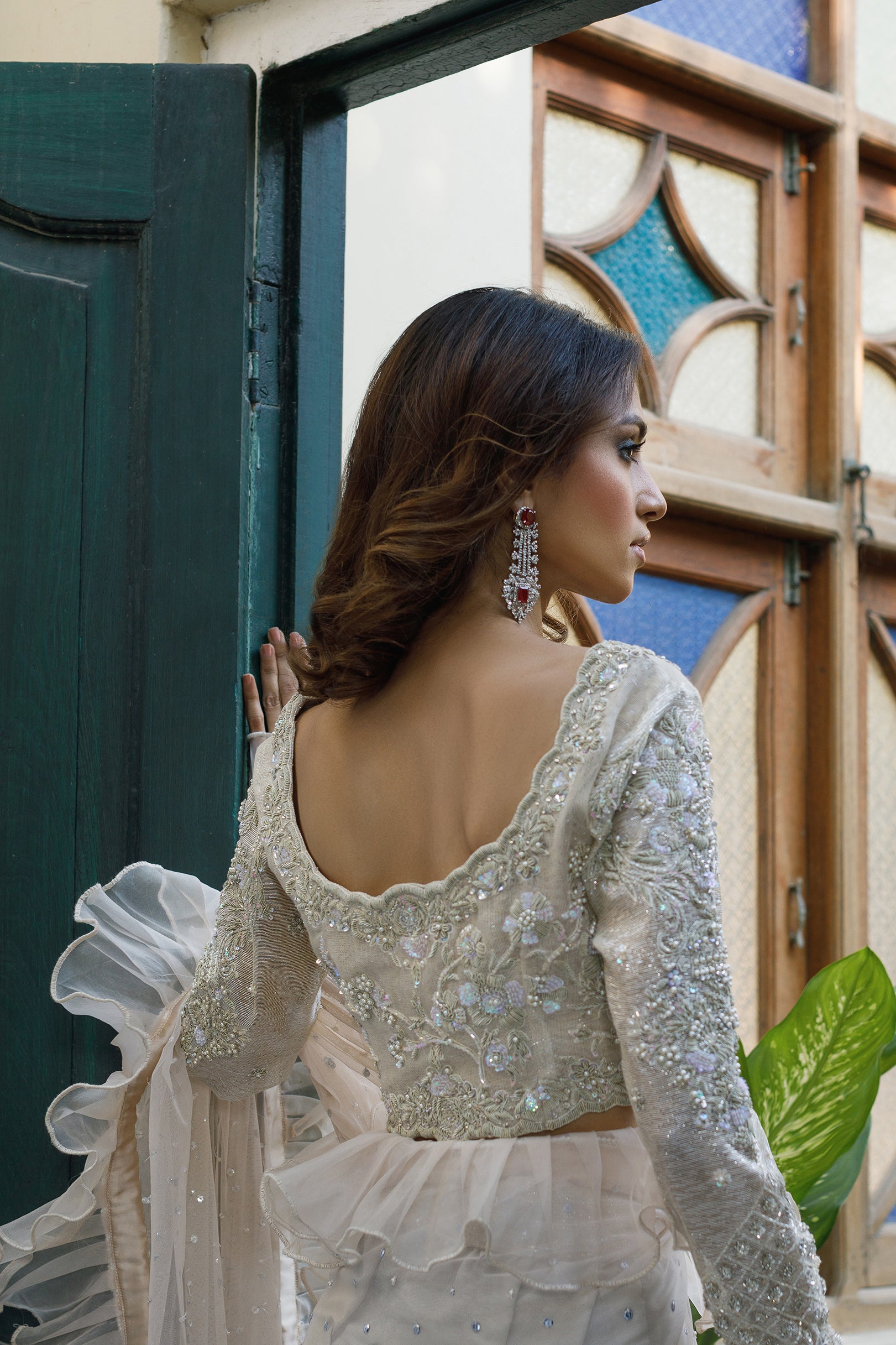 Shirt: The blouse is of cotton net material with total color-on-color handwork of kora, dabka, resham, sequins and mixed material.