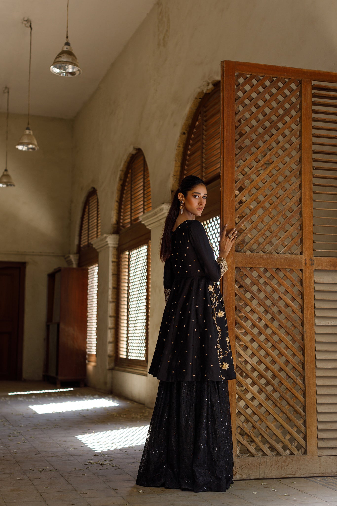 Shirt: Detailed Handwork including resham, Dabka, kora, Sequins and stones on bodice, ghaira & Sleeves. Fabric used is Sheesha silk.