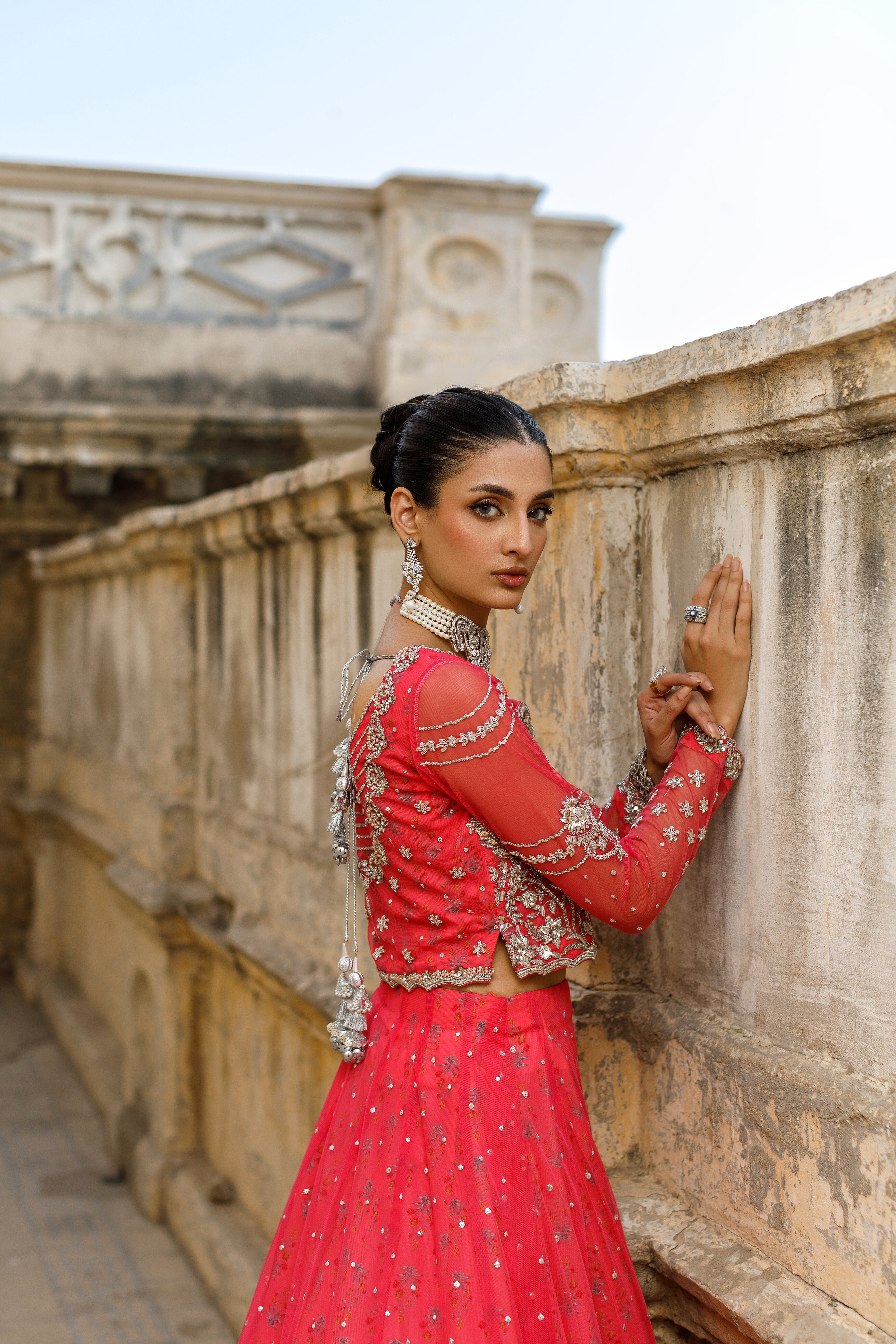Trouser: French Net Lehnga with boti and chan border alongwith digital printed lining inside as reflections. Lehnga has embroidered borders and pleated frills.