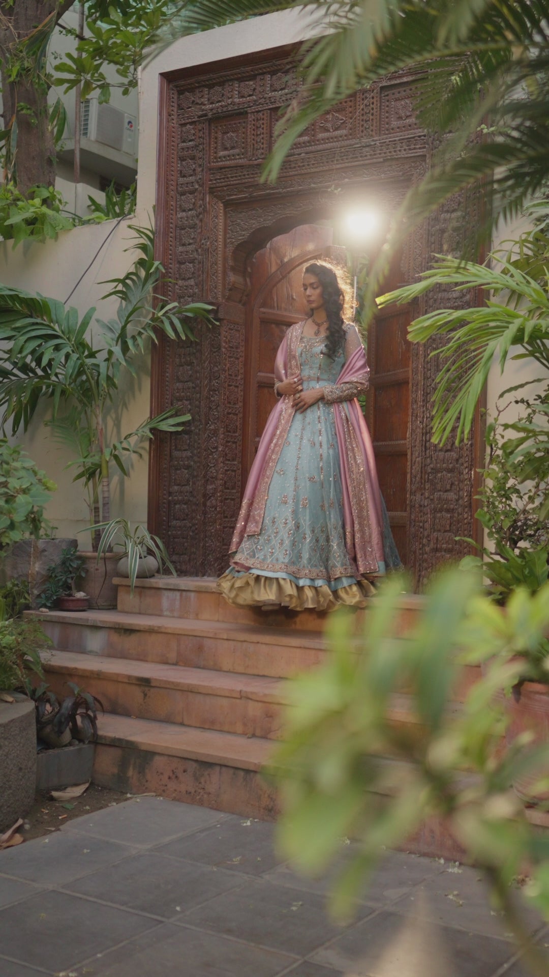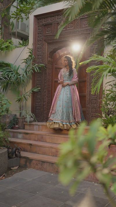 A breathtaking ferozi Anarkali that blends sheer French net elegance with intricate handcrafted detailing. The soft flare, delicate shimmer, and richly textured styling make this ensemble perfect for festive occasions — and beautiful enough to be elevated into a full bridal look.