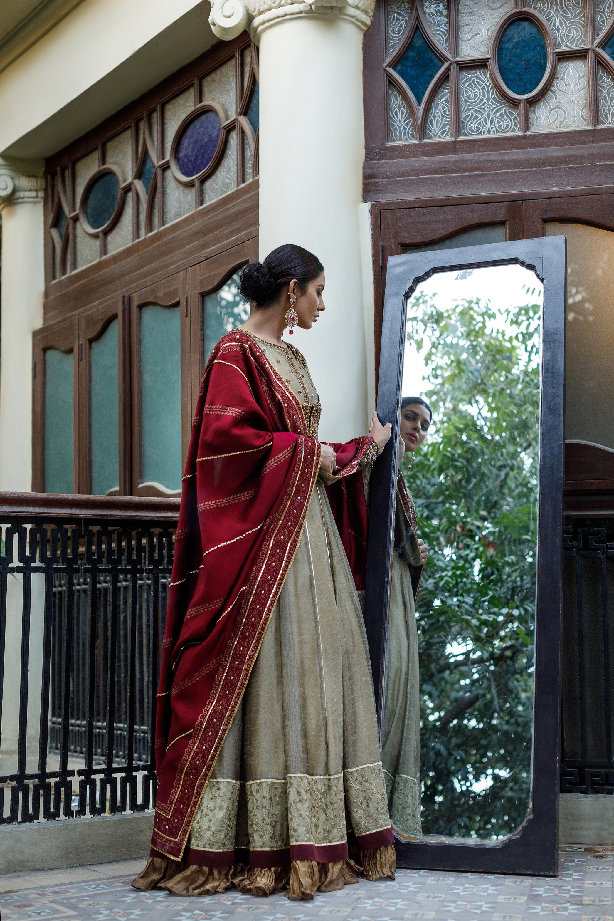 The maroon KOTTI is on pure cotton net with total handwork consisting kora, dabka and sequence and stones.