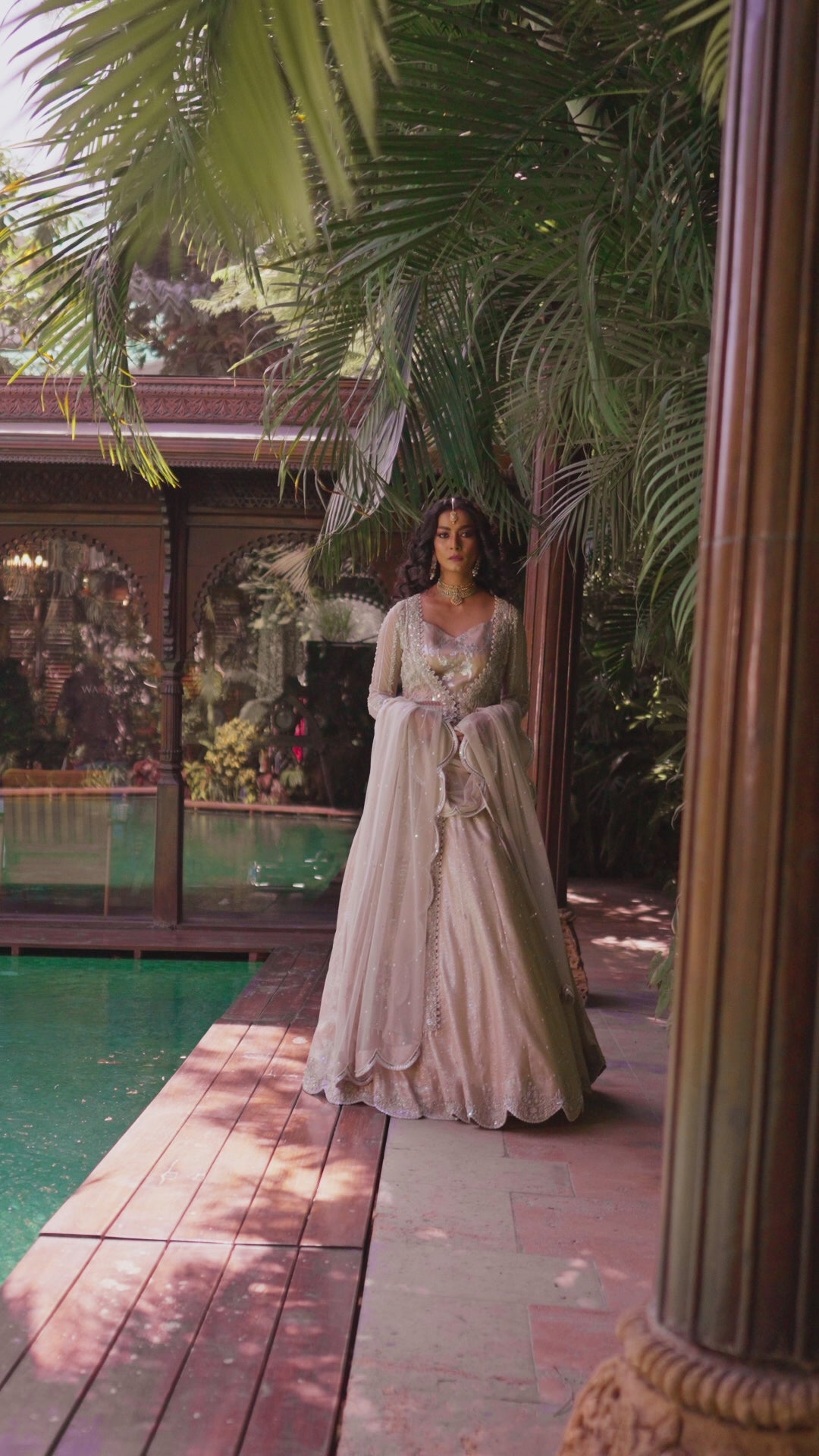 - Lehnga: Khaddi Banarsi base with boti chan and a scalloped hand-embroidered border.