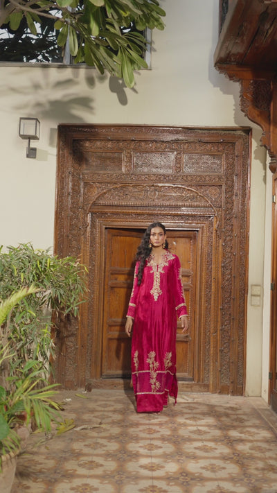 - Kaftan: Magenta embroidered sheesha silk kaftan adorned with intricate resham, kora, dabka, sequins, stones, and resham handwork on the neckline, sleeves, and hem border, finished with subtle embossed texture throughout.