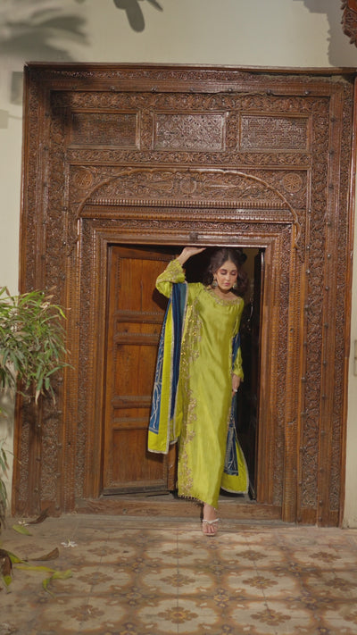 Rendered in embossed sheesha silk and adorned with intricate hand embellishment, this ensemble blends richness, artistry, and modern poise for an unmistakably regal festive look.