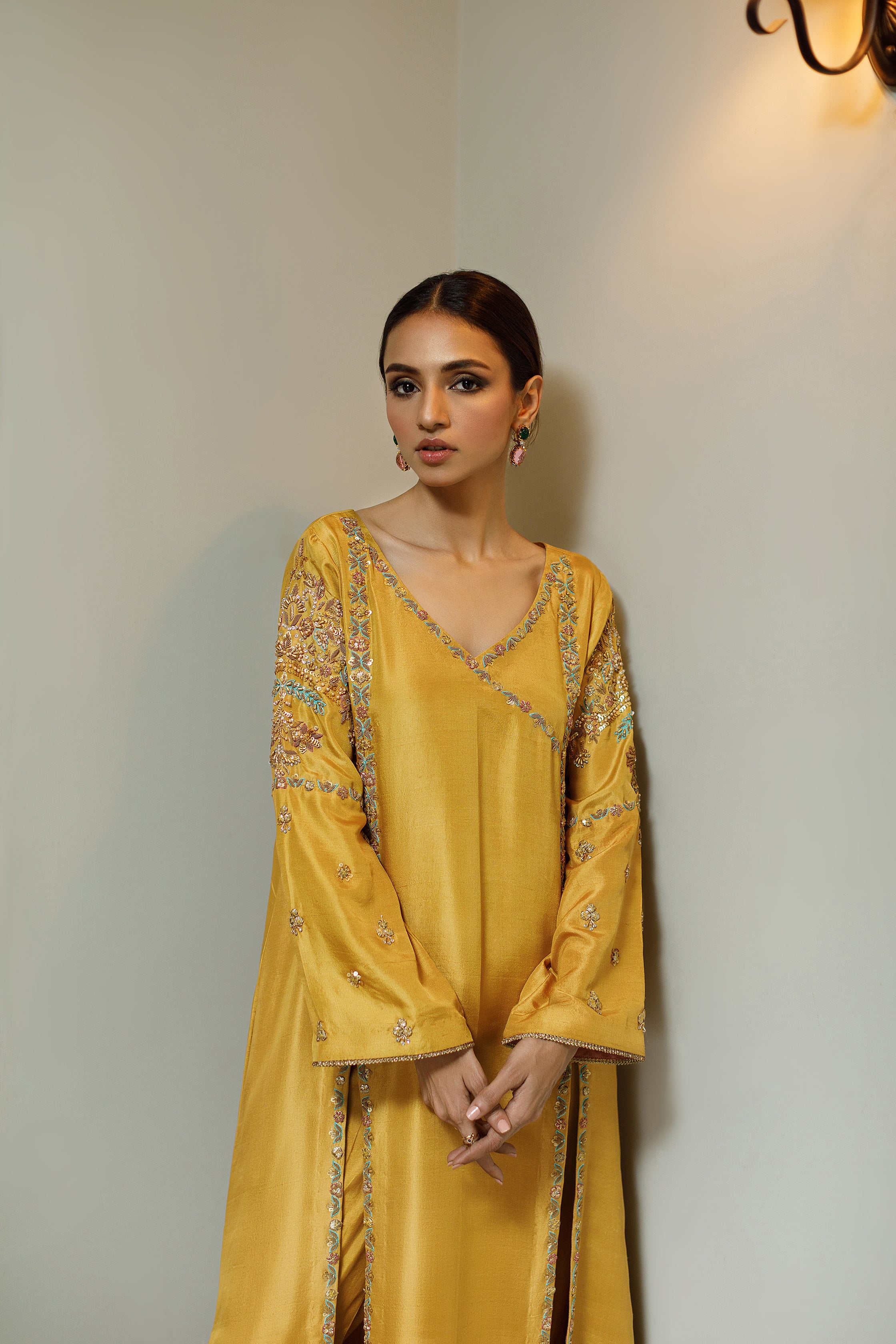 Shirt: Shirt is of pure raw silk with hand embellishment of resham, sequins and mixed material on the neck, panels, Daman and sleeves. Lining under the shirt is of semi raw silk.