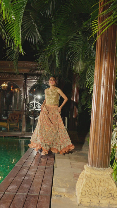 - Lehnga: Digital printed pure chiffon lehnga embellished with zari, gota, tilla and sheesha work, finished with a detailed hem.