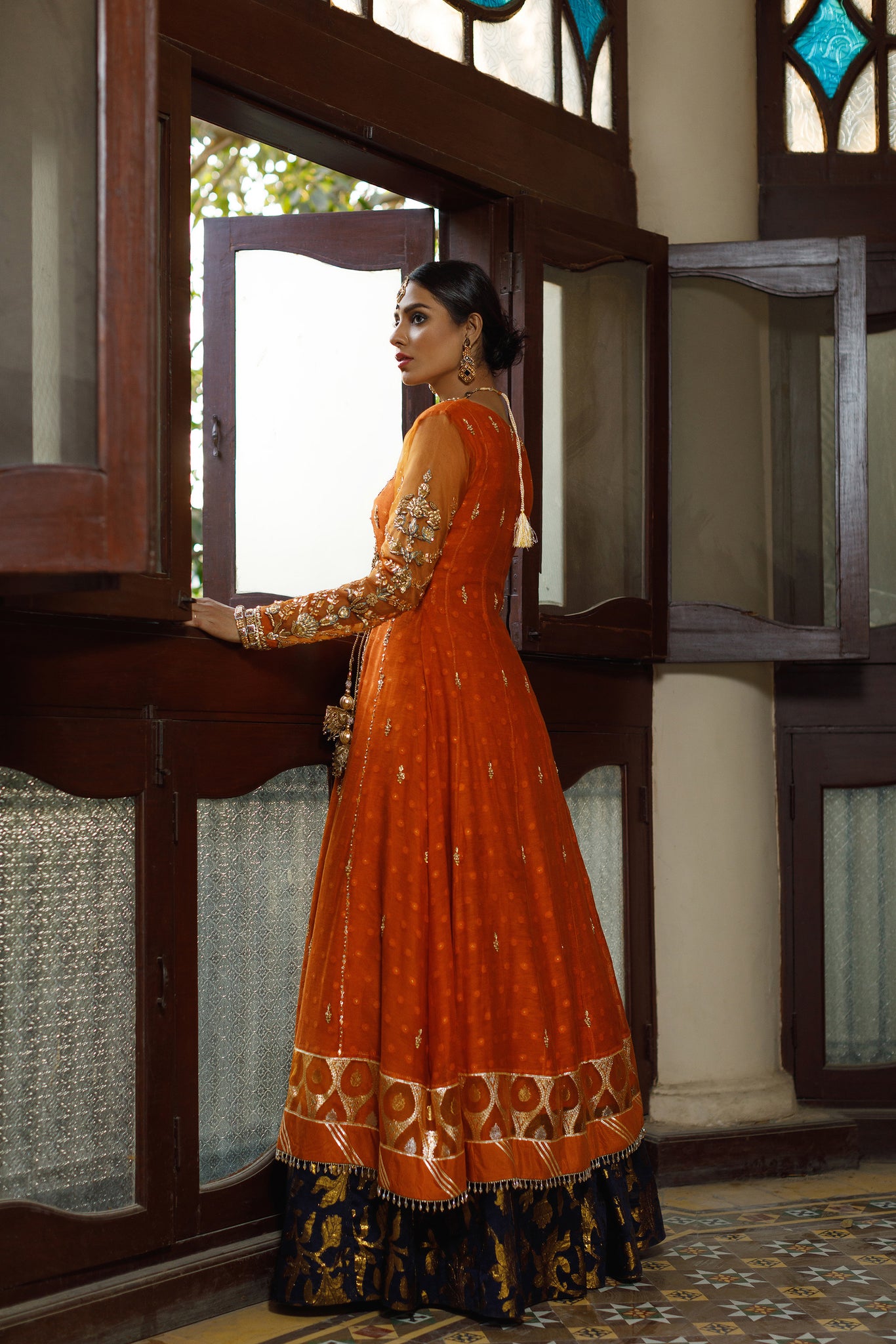 Shirt: Shirt is of pure cotton net with hand embellishment of kora, dabka, resham, sequins and mixed material on the neck, front and sleeves. The Daman has banarsi fabric and crystal hanging. The shirt is lined with semi pure raw silk.