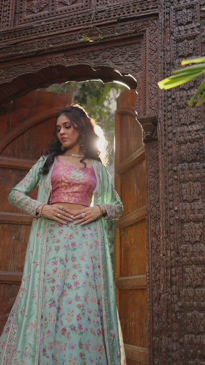 An ode to timeless elegance — this ensemble drapes you in serene hues, exquisite textures, and artisanal mastery, crafted for celebrations that call for quiet, unforgettable glamour.