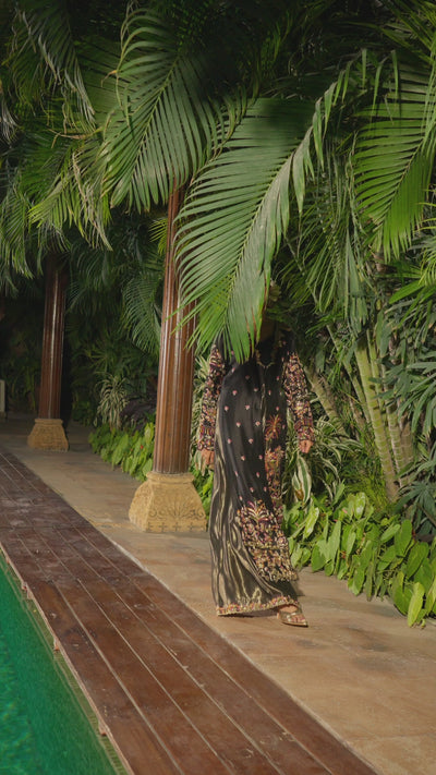 A midnight statement of elegance — rich black tones, intricate artistry and a silhouette that moves with quiet drama. Modern, regal and effortlessly striking, this jacket set is crafted for evenings that call for presence.