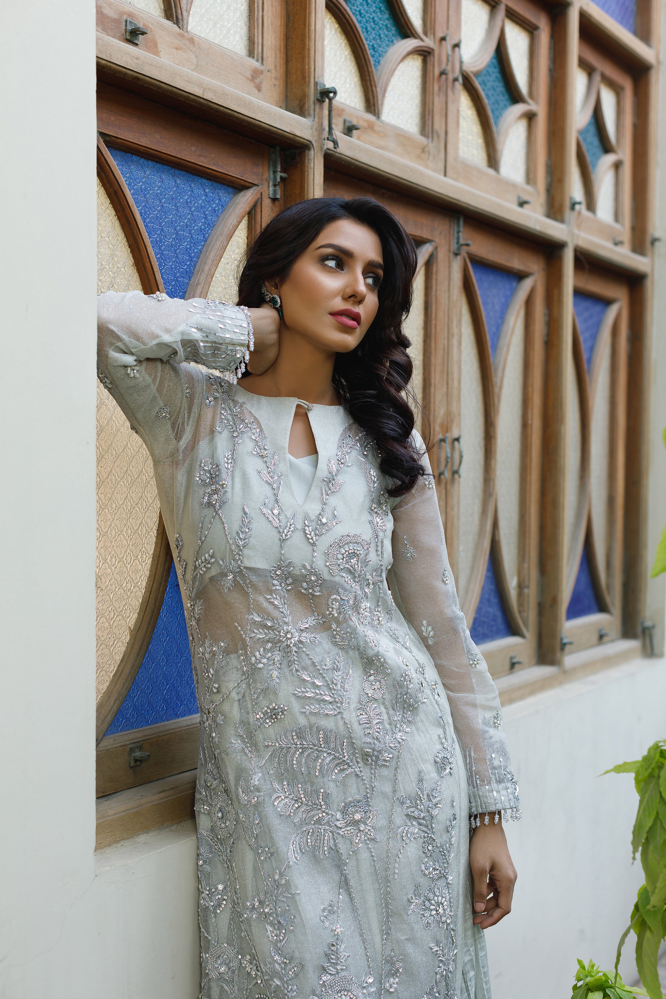 Shirt: Shirt is of pure tissue net with semi pure raw silk lining. Kameez is hand embellished with kora, dabka, resham, sequins and mixed material all over the front, back daman and sleeves.