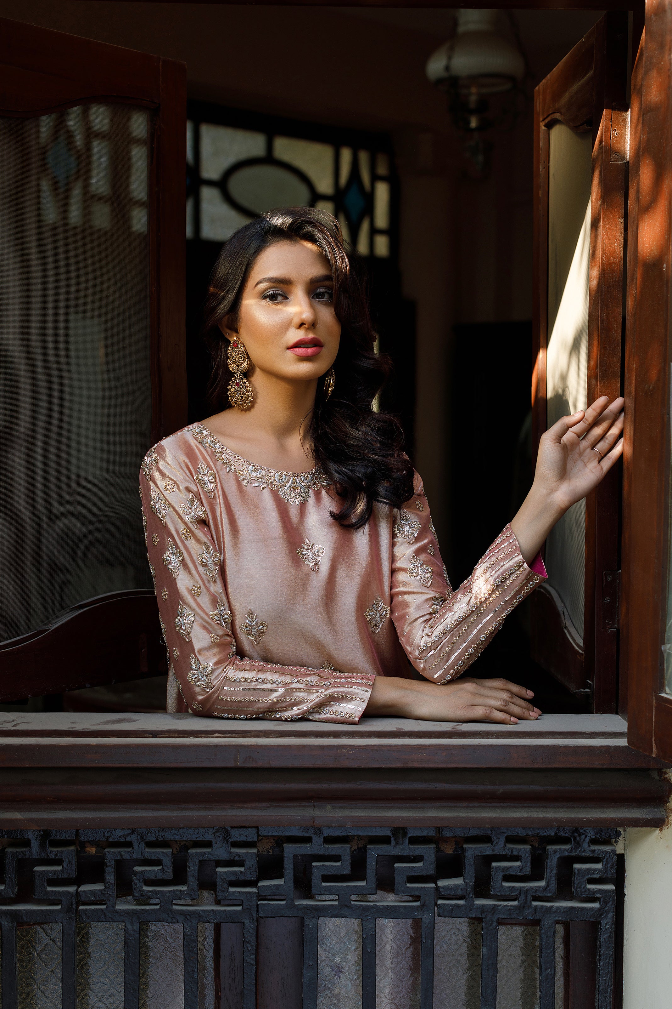 Shirt: Shirt is of pure tissue organza. Front, sleeves and back are hand worked with kora, dabka, resham, sequins and mix material. Shirt is underlined with semi pure raw silk.